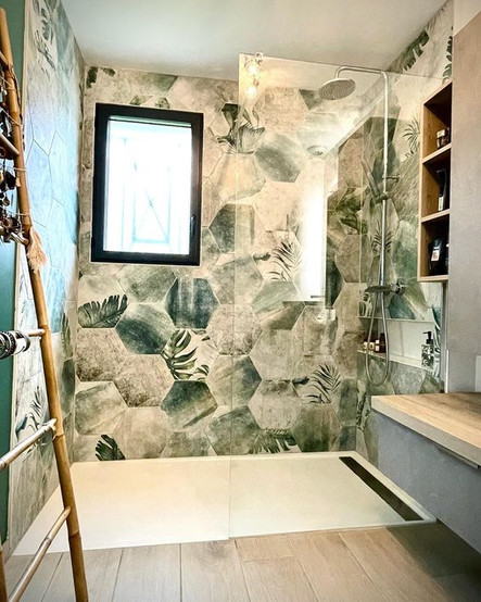 Mosaic Magic & Hexagonal Harmony: Playful and Modern Elegance: For a bold statement, vibrant green mosaic tiles add personality and creativity. They can be used for a captivating feature wall or floor. On the other hand, hexagonal tiles bring modern elegance with their unique shape and dynamic energy, making for a visually engaging design.